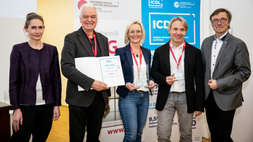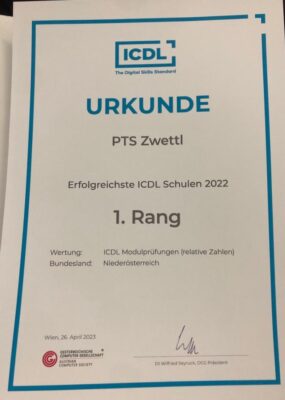Am Mittwoch, 26. April 2023, wurden in den Räumlichkeiten der Österreichischen Computer Gesellschaft (OCG) in Wien all jene ECDL/ICDL Schulen geehrt, die im letzten Schuljahr die meisten Zertifizierungsprüfungen für digitale Kompetenzen ablegten. Die Polytechnische Schule Zwettl hat die meisten Tests pro Schüleranzahl in Österreich absolviert und erlangte somit den Bundessieg. Insgesamt werden an über 800 Schulen in Österreich ECDL Prüfungen abgelegt.
