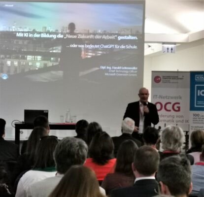 Harald Leitenmüller, CTO von Microsoft Österreich, hielt einen Vortrag zum Thema „Was bedeutet ChatGPT für die Schule?“